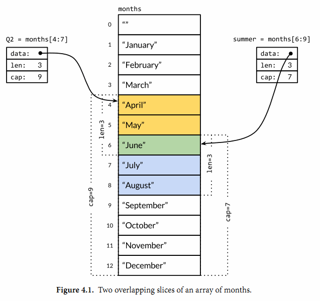 多个slice之间可以共享底层的数据,并且引用的数组部分区间可能重叠。图4.1显示了表示一年中每个月份名字的字符串数组,还有重叠引用了该数组的两个slice。数组这样定义