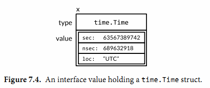 現在動態類型是*bytes.Buffer併且動態值是一個指向新分配的緩衝區的指針(圖7.3)。