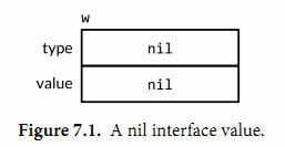 在Go語言中,變量總是被一個定義明確的值初始化,卽使接口類型也不例外。對於一個接口的零值就是它的類型和值的部分都是nil(圖7.1)。